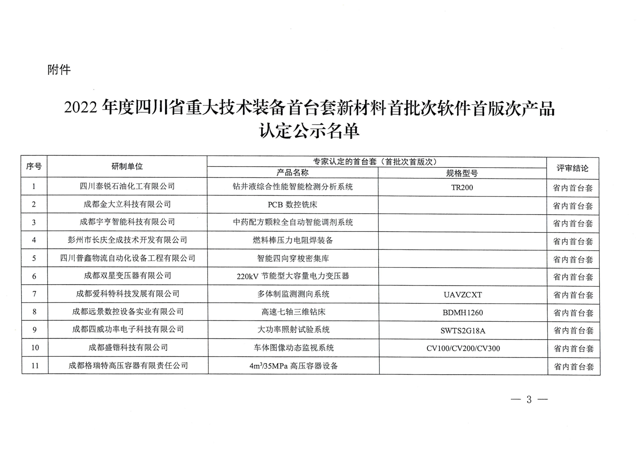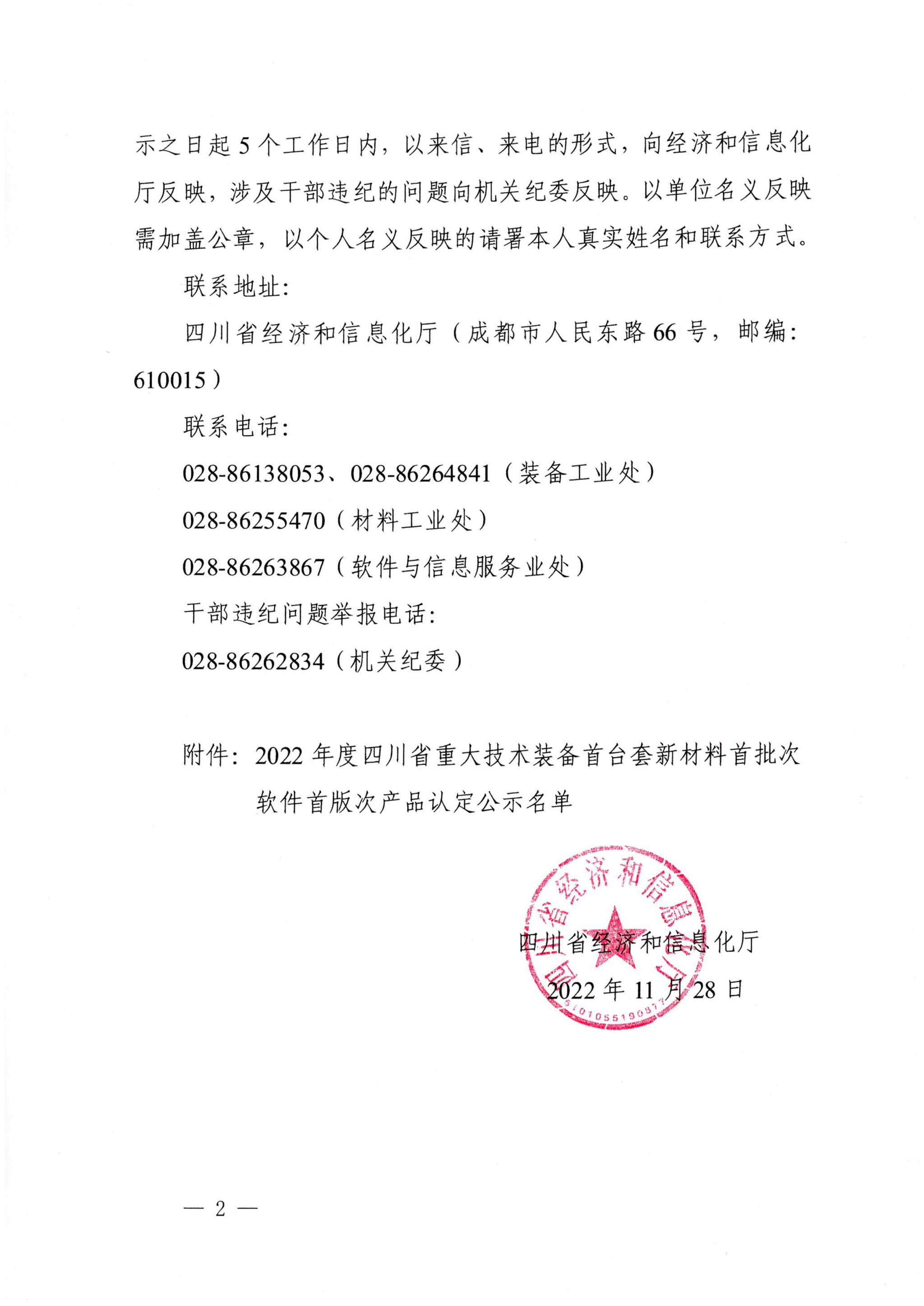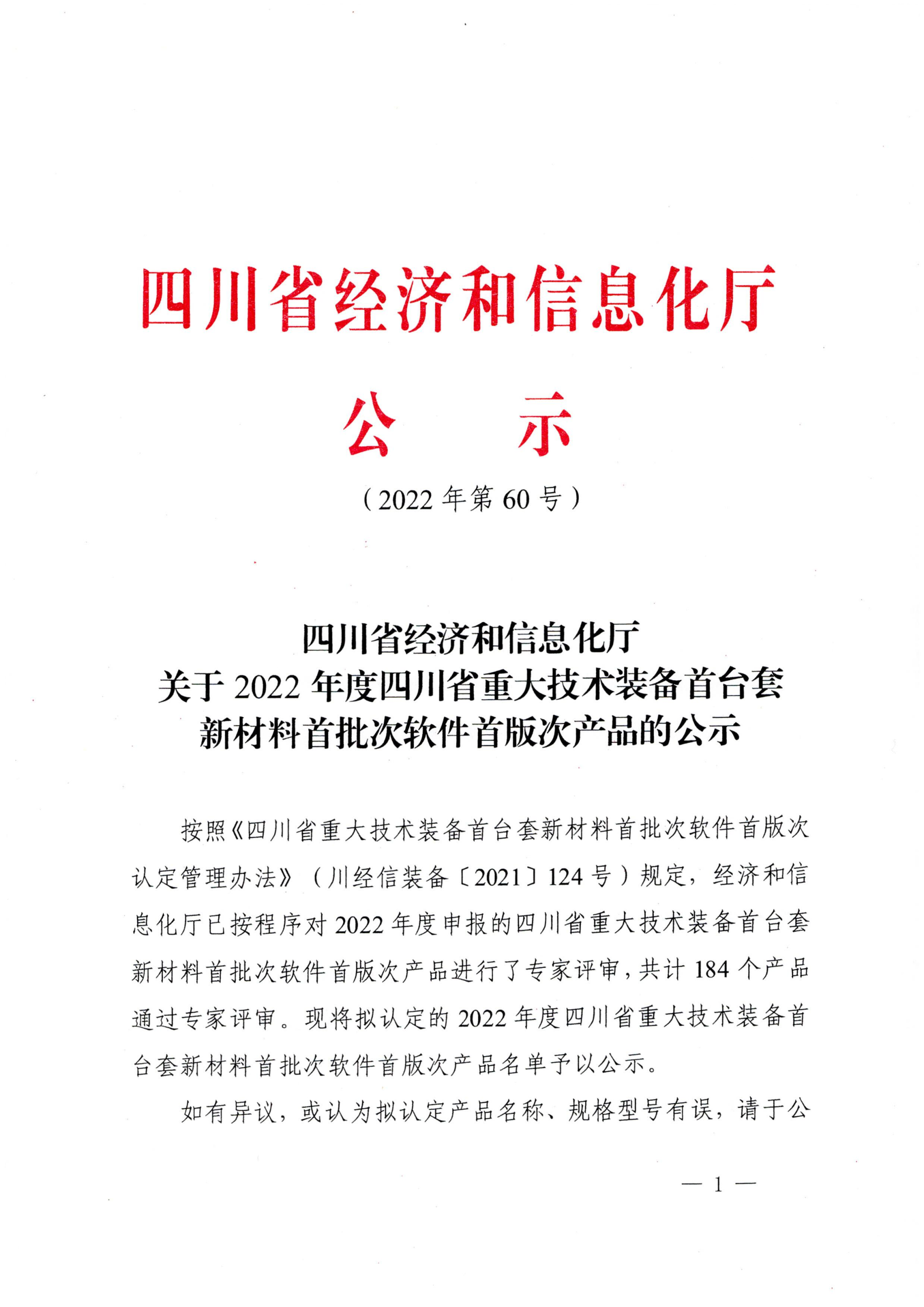 關于2022年度四川省重大技術裝備首臺套新材料首批次軟件首版次產品的公示 (2022年第60號)