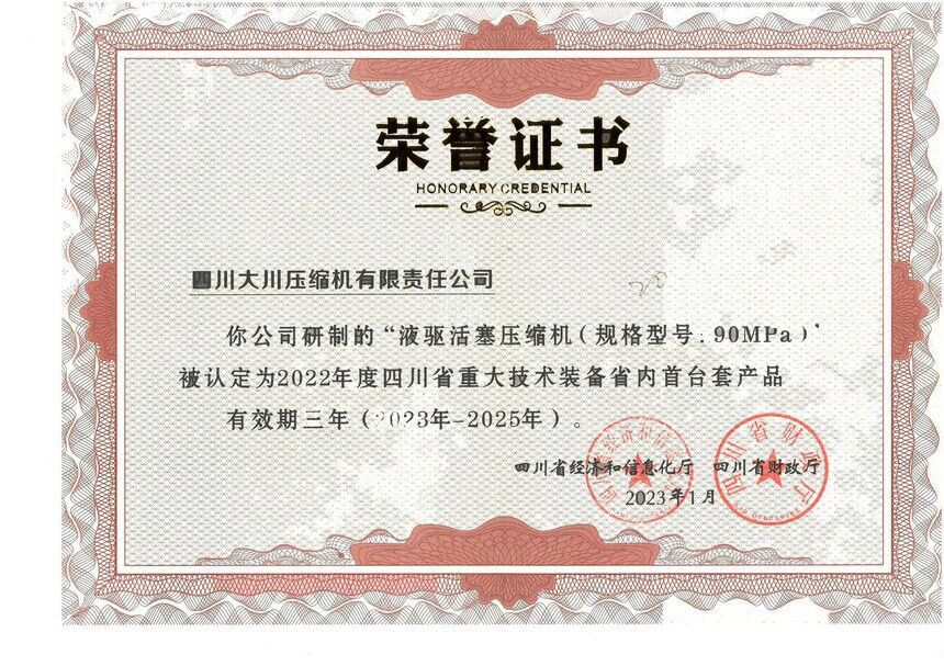 公司液驅活塞壓縮機榮獲2022年度四川省重大技術裝備首臺套產品