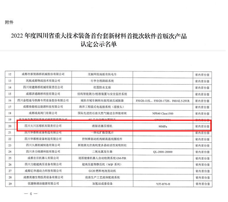 近日,四川(chuan)省經(jing)信(xin)廳、四川(chuan)省財政廳聯合發布2022年(nian)四川(chuan)省重(zhong)大技術裝備首臺套新材料首批次軟件首版次產(chan)品公告(2022年(nian)第(di)63號),四川(chuan)大川(chuan)壓縮機(ji)有限責任公司研(yan)制(zhi)的“液(ye)驅活塞(sai)壓縮機(ji)(規格(ge)型號:90MPa)”成(cheng)功(gong)入選。